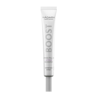 Dette høypotente konsentratet hjelper med å glatte ut hudens overflate, så rynker, fine linjer og slapp hud reduseres. Mádara BOOST Amino-Fill 3D Lifting Booster er formulert med aktive stoffer, som jobber intracellulært i hudlagene, og tilfører en høy konsentrasjon av aminosyrer, som fyller, jevner og glatter ut huden. Konsentratet gjør dessuten huden myk, og gir en sunn, ungdommelig fyldighet.