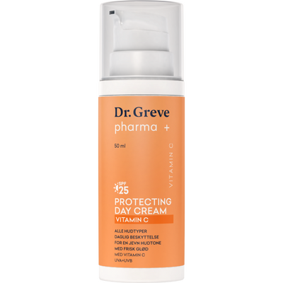 Dr. Greve Pharma Vitamin C Dagkrem SPF25 er en fuktgivende, beskyttende dagkrem med solfaktir 25.kremen inneholder ingrediesnesn vitamin C, som er en antioksidant som beskytter huden mot frie radikaler fra blant annet forurensning. Den motvirker også gusten hud og gir ny glød til huden, samt en jevnere hudtone.