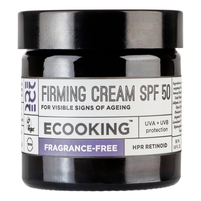 ECOOKING Firming Cream SPF50 FF er en ansiktskrem med oppstrammende effekt og uten tilsatt parfyme. Den inneholder stamcelleekstrakter som fjerner uønskede hudceller og forlenger hudens funksjon. Grønnalgeekstrakt styrker huden, mens HPR, en ny og mild form for retinoid, stimulerer cellefornyelsen og reduserer fine linjer.