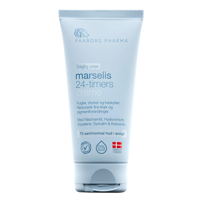 Faaborg Pharma marselis 24-timers krem er en fuktighetsgivende og beroligende ansiktskrem som pleier sensitiv hud døgnet rundt. Formelen inneholder niacinamid, som forebygger synlige aldringstegn og jevner ut pigmentforskjeller, og hyaluronsyre, som hjelper huden med å gjenvinne sin naturlige fuktbalanse og forbedre elastisiteten.