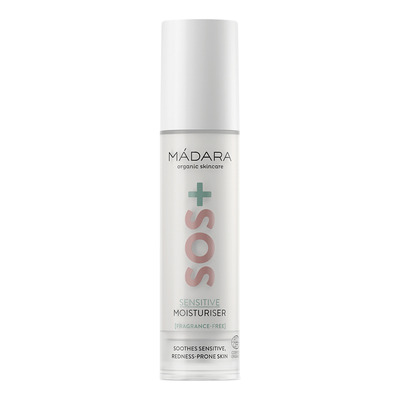 Mádara SOS+ SENSITIVE Moisturiser forbedrer kollagensyntesen og gir fuktigere og fastere hud.
