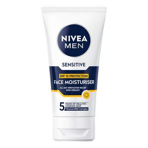Nivea Men Sensitive Face Cream SPF15 er en ansiktskrem spesielt utviklet for menn. Ansiktskremen gir ikke bare intens fuktighet, men beskytter også mot solens stråler med en beskyttelsesfaktor på 15. Den er formulert uten alkohol og bidrar til å redusere rødhet, tørrhet, stramhet og kløe. Kremen er beriket med kamilleekstrakt og vitamin E som virker beroligende og fuktighetsbevarende. Den lette formelen trekker raskt inn i huden uten å fedte og er dermatologisk testet.