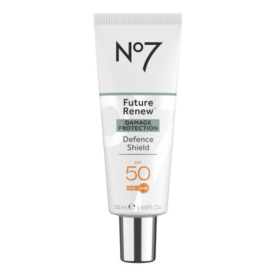 No7 Future Renew UV Defence Shield SPF50 er en dagkrem med høy solbeskyttelse som bidrar til å forebygge synlige tegn på solskader som fine linjer, rynker, tørrhet og ujevn hudtone. Formelen inneholder aldersbekjempende peptidteknologi og natriumhyaluronat som gir fuktighet og styrker hudens naturlige barriere.