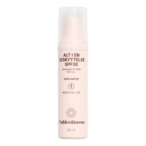 ALL IN ONE PROTECTION 30 SPF fra Pudderdåserne er en farget dagkrem med SPF 30 som inneholder 100 % mineralske solfiltre. Solfiltrene gir en høy og bredspektret beskyttelse mot solens skadelige UV-stråler ved å reflektere strålene bort fra huden og dermed minimere hudirritasjon. ALL IN ONE PROTECTION SPF 30 inneholder blant annet hyaluronsyre, C-vitamin og er parfymefri, den har høy beskyttelse mot blått lys, UVA, UVB og infrarøde stråler. Produktet kan brukes alene som solbeskyttelse, men på grunn av den lette og tørre konsistensen vil de fleste foretrekke å bruke den oppå en annen krem.