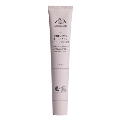 Rudolph Care Firming Therapy Rich Cream er en ekstra rik dag- og nattkrem som er utviklet for moden og tørr hud. Den avanserte formelen inneholder stamcelleteknologi fra eple, som aktiverer hudens naturlige fornyelsesprosess ved å etterligne cellesignalering. To typer hyaluronsyre holder på fuktigheten og gir fyldigere hud. Hestekastanjeblomst bidrar til å redusere fine linjer, mens et kompleks av grønnkål, gulrot og sitron stimulerer kollagenproduksjonen og forbedrer hudens elastisitet.