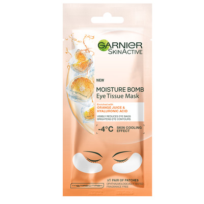 Garnier har utviklet denne sheet-øyenmaske, hvor den aktive formel tilfører nytt liv til trette og triste øyne ved å motvirke mørke ringer og poset hud. Maskens formel er beriket med fuktgivende hyaluronsyre, som hjelper med å glatte ut- og utfylle huden, så den synes fastere. Den inneholder også appelsinsaft som er rik på antioksidanter og C-vitamin, som motvirker tidlig aldring og virker lysnende. Masken gir en - 4°C kjølende effekt, så du oppnår øyeblikkelig friskere øyne som stråler av liv.