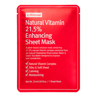 By Wishtrend Natural Vitamin 21.5% Enhancing Sheet Mask er en ansiktsmaske i sheet-format utviklet for å gi huden fuktighet og glød. Masken inneholder 11 % vitamin C og 10,5 % vitamin E.