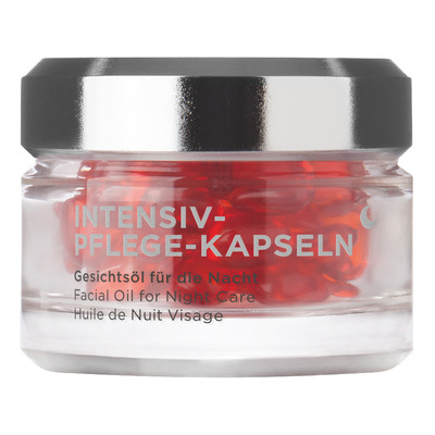 Intensive Care Capsules til bruk om natten. Oljekapslene beroliger stresset hud som er sensitiv, rød og tørr. Kapslene inneholder ceramider som styrker hudens barriere og evne til å binde fuktighet. I tillegg inneholder de også en oljebasert konsentrasjon av aktive ingredienser, som gurkemeieolje, vitamin A, E, C og aprikoskjerneolje, som sammen pleier og strammer opp huden for en fastere hud.