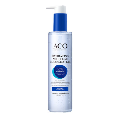 ACO Hydrating Micellar Cleansing Gel fjerner effektivt sminke og smuss uten å tørke ut huden. Med hyaluronsyre, prebiotika og panthenol gir den fuktighet og beroliger huden samtidig som den gjenoppretter hudens balanse. Den er dermatologisk testet, parfymefri og egnet for sensitiv hud, også rundt øynene.