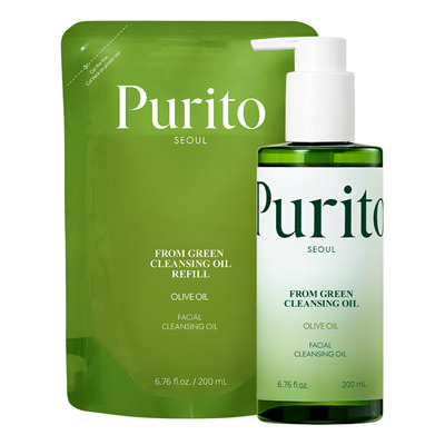 Purito SEOUL From Green Cleansing Oil + Refill er et sett med Purito SEOUL's populære renseolje og en refill-pose. Denne milde og beroligende renseoljen er basert på naturlige oljer som effektivt fjerner kraftig sminke, solkrem og overflødig talg uten å irritere øyne eller hud.