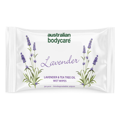 Australian Bodycare Lavender Wet Wipes er praktiske våtservietter for rask rengjøring av ansikt og kropp når du er på farten