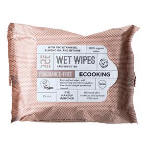 Ecookings våtservietter fjerner effektivt sminke, men renser også huden skånsomt. De fjerner øye-, leppe- og ansiktssminke, samt skitt og smuss. De er laget av 100% økologisk bomull, som gjør disse serviettene supermyke og behagelige å bruke. Med tilsetning av pleiende provitamin B5, mandelolje og aminosyre sikrer de at huden forblir fuktet og oppfrisket etter hver bruk.