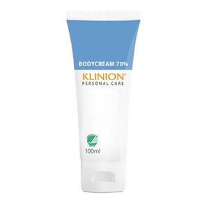 Klinion Bodycream 70% er en spesiell fettkrem til sensitiv og tørr hud. Den øker hudens elastisitet og fuktighet. Kremen har et høyt fettinnhold på 70% som forebygger ru og oppsprukket hud. Kremen kan brukes ved mistanke om allergi ovenfor andre hudpleieprodukter, og etter behov på hele kroppen eller problemområder, f.eks hendene, ledd, eller ansikt.