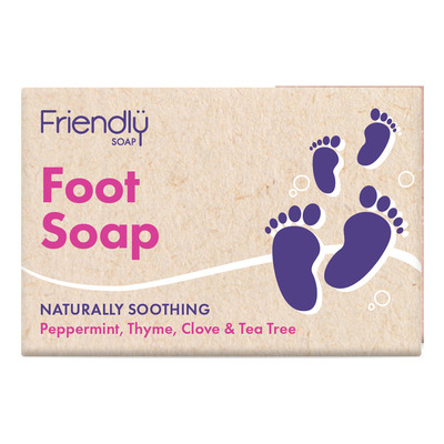 Friendly Foot Soap er en håndlaget såpe som er utviklet for å pleie og friske opp slitne føtter. Såpen inneholder sheasmør, peppermynte, tea tree, nellik og timian som mykgjør, deodoriserer og beskytter huden. Den naturlige pimpsteinen eksfolierer skånsomt og fjerner hård hud, mens røttene til Rubia Tinctorum beroliger føttene. Såpen egner seg for daglig bruk og er perfekt for en komplett fotpleierutine.