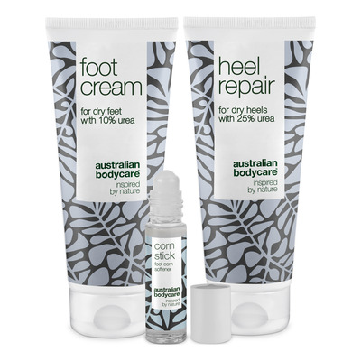 Australian Bodycare Corns & Calluses Kit er den ultimate løsningen for hard hud, tørre føtter og smertefulle liktorn. Settet består av tre fotpleieprodukter som er utviklet for å løse opp hard hud og gjøre føttene myke og glatte igjen. Settet inneholder en fotkrem med 10 % Urea for daglig bruk, en intensiv hælkrem med 25 % Urea for spesielt tørre og harde områder og en effektiv maisolje med salisylsyre for målrettet behandling av liktorn. Urea, som er en viktig ingrediens, binder fuktighet i huden for å forebygge tørrhet og hælsprekker, mens salisylsyre i maisoljen mykgjør og fjerner død hud. Tea Tree Oil i alle produktene sørger for en sunn hudflora. Dermatologisk testet og egnet for alle hudtyper.