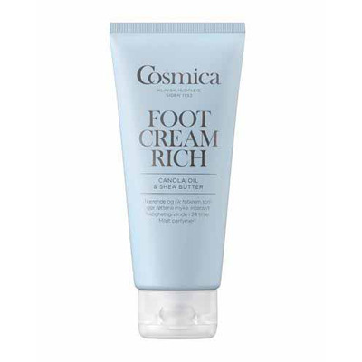 Cosmica Fotkrem rich er en rik og fuktgivende fotkrem som pleier og mykgjør tørr hud på føttene. Inneholder sheasmør og naturlig olje av raps. Kremen trekker raskt inn og har en mild og behagelig duft.