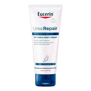 Eucerin UreaRepair Plus 10% Urea Foot Cream er spesielt utviklet for å gi intensiv fuktighet og pleie til svært tørre, ru og sprukne føtter. Den inneholder en unik kombinasjon av 10 % urea, ceramider og andre naturlige fuktighetsbevarende faktorer (NMF) som binder fuktighet i huden og gjenoppretter hudens naturlige beskyttelsesbarriere for å forhindre ytterligere fukttap. Kliniske og dermatologiske studier har vist at kremen gir umiddelbar lindring og intens, langvarig fuktighet, og gjør huden mer motstandsdyktig mot tørrhet i opptil 48 timer. Den absorberes raskt uten å etterlate en fet følelse og passer for personer med tørre, ru og sprukne føtter.