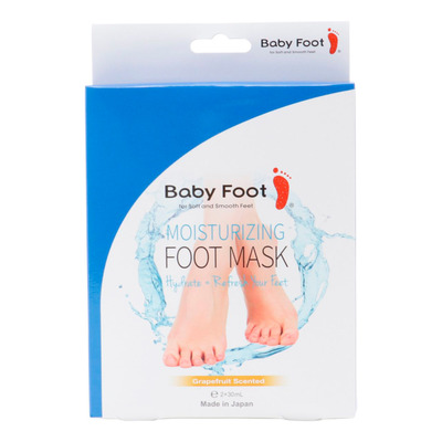Baby Foot Moisturising Foot Mask kommer som et par engangsplastsokker med gel og frisk grapefruktduft. Sokkene passer skostørrelse 36-45 og er enkle å påføre hjemme. De aktive ingrediensene trenger raskt inn og har en merkbar effekt. Masken passer for alle hudtyper og trenger ikke skylles av etter bruk.