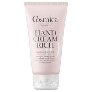 Cosmica Hand Cream rich er en rik og nærende håndkrem som gir fukt og pleie til tørre hender. Kremen har en god konsistens som trekker raskt inn, samtidig som den gir umiddelbar følelse av myke og glatte hender. Inneholder rapsolje som er naturlig rim på vitamin E, samt anioksidanten Q10. Mildt parfymert.