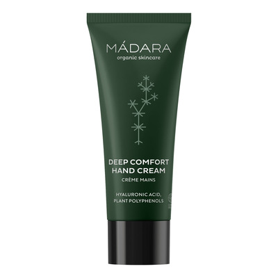 Denne håndkremen fra Mádara inneholder hyaluronsyre og kakaosmør som nærer, fukter, mykgjør og glatter ut huden. Håndkremen inneholder også ekstrakter av kjerringrokk og løvefot, som tilfører huden viktige antioksidanter for langvarig beskyttelse og pleie av hendene. Håndkremen er dermatologisk testet, vegansk og sertifisert av EcoCert.