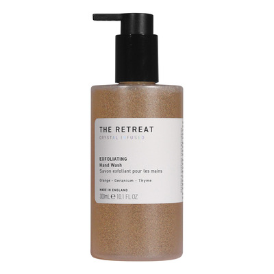 Retreat Exfoliating Hand Wash er en 90 % naturlig håndsåpe som renser, eksfolierer og mykgjør hendene i ett trinn. Formelen inneholder naturlig finmalt pimpstein som skånsomt og effektivt fjerner døde hudceller, samt aloe vera og kamilleekstrakt som beroliger og gir næring til huden under vaskingen. Såpen er sertifisert av Ecocert Greenlife, vegansk og dermatologisk testet.