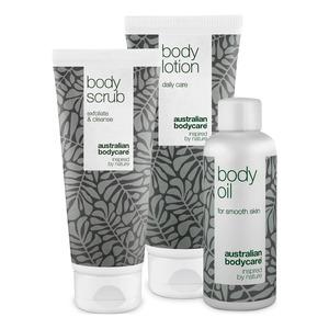Sampak med 3 kroppsprodukter som kan forbedre hudens generelle utseende og redusere synligheten av ujevnheter. Strekkmerker og arr er kommet for å bli, men med disse fuktighetsgivende og mykgjørende kroppsproduktene kan du minimere synligheten av dem. Pakken inneholder en bodylotion, en kroppsskrubb og en kroppsolje. Når huden er sunn og fuktet, blir strekkmerker, arr og cellulitter mindre synlige, og huden blir glattere og får mer glød.