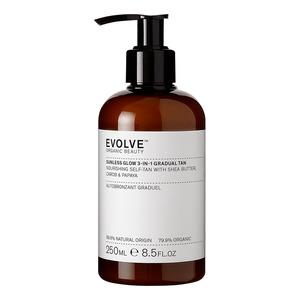 Evolve Sunless Glow 3-i-1 Gradual Tan er spesielt utviklet for å bygge opp en fin brunfarge på kroppen. Lotionen inneholder økologiske og naturlige ingredienser som alle har en aktiv effekt på huden. Innholdet av papaya glatter ut huden og gir en jevn overflate. I tillegg forbereder kremen huden på solstrålene som vi utsettes for i løpet av sommeren. Økologisk aloe vera lindrer tegn på irritasjon og rødhet. Sist, men ikke minst, gjenoppretter sheasmør hudens normale funksjon for å minimere tegn på tørrhet.