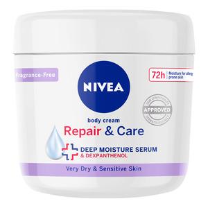 Nivea Repair & Care Body Cream er en parfymefri bodylotion som er spesielt god for svært tørr og sensitiv hud. Denne bodylotionen er laget av en nærende formel med Deep Moisture Serum og dexphanthenol, som binder fuktighet i huden og styrker hudbarrieren. Bodylotionen gir intensiv fuktighet i opptil 72 timer. Den har en mild og beroligende effekt på huden og er dermatologisk testet.