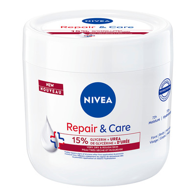 Nivea Repair & Care Body Cream Urea er en effektiv løsning for svært tørr og ru hud. Den inneholder 15 % glyserin og urea som gir huden fuktighet i dybden og reparerer synlige tegn på tørrhet allerede etter første påføring. Den avanserte formelen beskytter mot fukttap og holder huden næret og fuktet i opptil 72 timer.