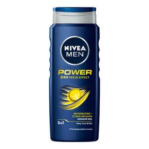 Nivea Men Power Fresh Shower Gel er en kroppssåpe spesielt utviklet for menn. Såpen rengjør effektivt og skånsomt hår, kropp og ansikt. Dusjgelen er laget med en nærende sitrusformel som gir den en ekstra friskhet og kraftig duft. Hår og hud etterlates med en frisk og fuktig følelse.
