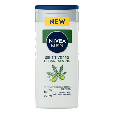 Nivea Men Sensitive Pro Ultra Calming Shower Gel er en beroligende kroppssåpe spesielt utviklet for menn. Såpen er laget med en mild og pleiende formel med plantebasert hampefrøolje og vitamin E, som virker beroligende og lindrende på huden. Den er egnet for sensitiv hud og kan brukes på kroppen, i ansiktet og i håret. Dusjgelen er dessuten vegansk og dermatologisk testet.