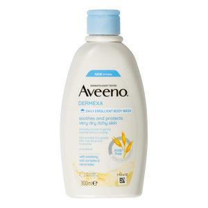 Aveeno® Dermexa Daily Emollient Body Wash tilbyr en unik kombinasjon av pleie og beskyttelse for svært tørr, kløende og eksemutsatt hud. Denne kroppsvasken inneholder et prebiotisk havrekompleks (havremel og havreekstrakt) og ceramider som virker sammen for å rense huden skånsomt uten å tørke den ut.