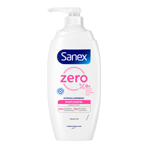Sanex Zero% Shower Gel med pumpe har en skånsom, parfymefri formel som gir fuktighet til huden