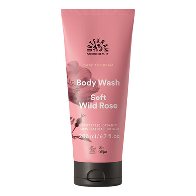 Urtekrams Soft Wild Rose Body Wash er en rensende kroppssåpe med fuktighetsgivende og myknende ingredienser av 100 % naturlig opprinnelse. Kroppssåpen inneholder blant annet hyaluronsyre, glyserin og økologisk aloe vera som både renser og fukter huden og gjør den herlig myk. Soft Wild Rose Body Wash er også beriket med eterisk olje fra villroser som gir en skjønn og forfriskende duft.