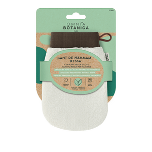 Ofte er tradisjonelle orientalske badehansker laget av geitehår, men nå har Omnia Botanica utviklet en vegansk versjon av vegetabilsk viskose-crepe. Hansken passer for hammam (tyrkisk bad) og ritualer i orientalske bad, hvor den fjerner død hud og hjelper til med å fjerne inngrodde hår. Hansken kan vaskes i maskin på 30°C.