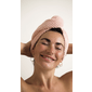Hårhåndkleet fås i fargene lyseblå, pudder, rosa og sand.