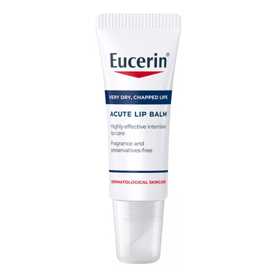 Eucerin Acute Lip Balm inneholder en unik kombinasjon av aktive ingredienser som effektivt lindrer tørre, sprukne og irriterte lepper. Den beroligende formelen reduserer rødhet og irritasjon samtidig som den fremmer hudens naturlige regenerering. Leppene etterlates fuktede, myke og glatte. Produktet er spesielt godt egnet for huden rundt munnen og kan også brukes ved leppeslirekseksem eller tørrhet forårsaket av medisinsk behandling.