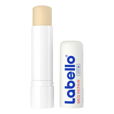 Labello Med Repair Lip Balm fukter og pleier leppene i opptil 24 timer. Leppepomaden er laget med en unik formel av naturlige oljer som smelter sammen på leppene. Den inneholder SPF 15, som beskytter mot solens stråler. Leppepomaden mykgjør leppene og forebygger sprekker og tørrhet. Den er også dermatologisk testet.