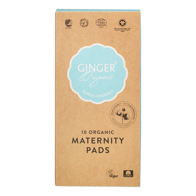 Ginger Organics postpartum bind laget av 100 % økologisk bomull og biologisk nedbrytbar emballasje