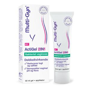 Multi-gyn ActiGel 2in1 er for kvinner som lider av ubehagelige symptomer knyttet til bakteriell vaginose (BV). Gelen behandler tynt, gråaktig utflod, fiskelukt, kløe, irritasjon, følsomhet, rødhet, ømhet og har en direkte lindrende effekt. Produktet inneholder det patenterte 2QR-komplekset som blokkerer skadelige bakterier på en trygg og naturlig måte og optimaliserer vaginalfloraen.