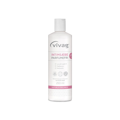 Den milde Vivag intimsåpen har en lav pH på 4 og er ideell for deg som ønsker å opprettholde intimhygienen på en mild og skånsom måte uten å forstyrre fuktbalansen eller irritere sart hud. Vivag intimsåpe er helt fri for parfyme, fargestoffer og konserveringsmidler - og anbefales av Asthma Allergy Nordic.