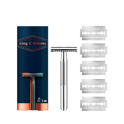 Double Edge Razor fra King C. Gillette leveres sammen med fem knivskarpe platinabelagte blader med lang holdbarhet. Bladene har i tillegg et anti-friksjonsbelegg som sørger for at du får en behagelig opplevelse under barbering av skjegget. Double Edge Razor gir også nøyaktig barbering av bakkenbarter, bart og skjegget tett på munnen.