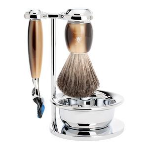 Eksklusivt barbersett fra Mühle Shaving i vakkert brunt horn - Fusion-barbermaskin og naturbørste