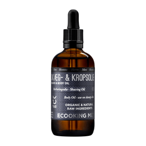 Skjegg- og kroppsoljen fra Ecooking Men er en multifunksjonell olje som blant annet kan brukes til barbering, som kropps- og skjeggpleie samt til behandling av tørr, irritert hud og eksem. Den inneholder blant annet økologisk sesam, argan, jojoba og mandelolje, som alle virker mykgjørende. I tillegg inneholder den økologisk aprikosolje, som er rik på vitamin A og E, som lett absorberes av huden og har gjenoppbyggende egenskaper.