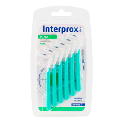 Interprox Plus Micro er en mellomromsbørste som er utviklet for å rengjøre mellom tennene, under broer og rundt implantater. Med det vinklede hodet får du maksimal rengjøring av mellomrommene mellom tennene, ettersom børsten lett når alle områder.