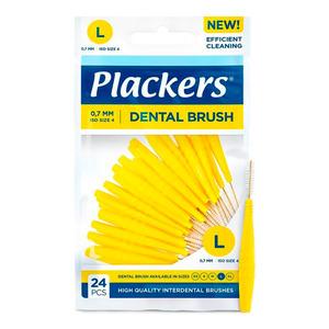 Plackers Dental Brush L 0,7 mm er en mellomromsbørste som er utformet for å gjøre det enkelt å fjerne plakk og matrester fra vanskelig tilgjengelige steder. Den har et lett bøyelig håndtak som gjør det lettere å komme til mellom tennene. Metalltråden i børsten er plastbelagt for å beskytte tennene under bruk. Denne børsten er også ideell for rengjøring av implantater, tannregulering og brokonstruksjoner. Plackers Dental Brush er tilgjengelig i forskjellige størrelser fra XS (0,4 mm) til XL (0,8 mm).