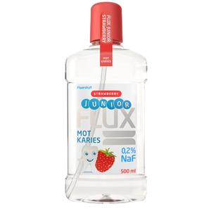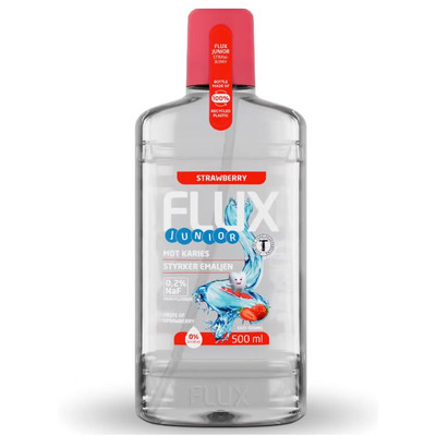 Flux Junior fluorskyll (0,2% Naf) er et munnskyll spesielt laget for barn, med et passende fluorinnhold og en smakfull jordbærsmak. Ved regelmessig bruk hjelper det å forebygge karies. For best resultat anbefales det å skylle med 10 ml én til to ganger daglig etter tannpuss med fluortannkrem.