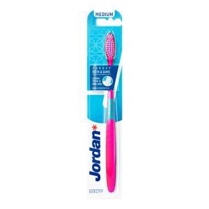 Jordan Target Teeth & Gums Medium er utviklet for effektiv tannpuss med fokus på både tenner og tannkjøtt. Tannbørsten har et børstehode med dobbeltvirkende bust: konkav bust på utsiden for rengjøring langs tannkjøttlinjen og opphøyde bust i midten for å fjerne plakk fra tannoverflaten. Den aktive spissen sørger for at selv de bakerste tennene nås enkelt.