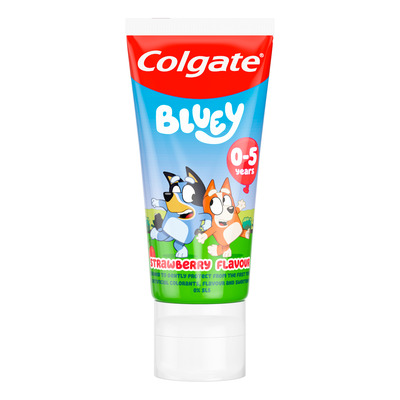 Colgate Tannkrem Bluey 0-5 år er en mild tannkrem med jordbærsmak for melketenner