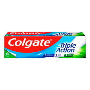Colgate Triple Action Toothpaste gir trippel beskyttelse med sin unike stripete formulering i blått, hvitt og grønt. Denne tannkremen beskytter mot hull i tennene, bidrar til å holde tennene naturlig hvite og gir friskere pust med mintsmak.